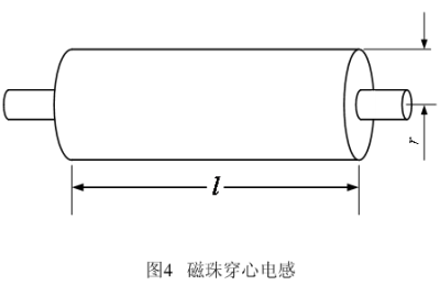 穿心電感的電感量一般都比較小,大約在幾微亨到幾十微亨之間,電感量大小與穿心電感中導(dǎo)線的大小以及長度,還有磁珠的截面積都有關(guān)系,但與磁珠電感量關(guān)系最大的還要算磁珠的相對導(dǎo)磁率 。圖3、圖4是分別是指導(dǎo)線和穿心電感的原理圖,計算穿心電感時,首先要計算一根圓截面直導(dǎo)線的電感,然后計算結(jié)果乘上磁珠相對導(dǎo)磁率