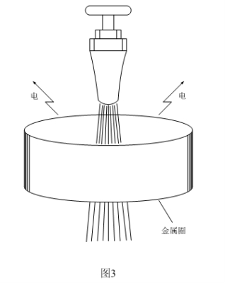 圖3是一個讓物體產(chǎn)生高壓電的原理圖,在水龍頭的下面安放一個用金屬薄片制作的圓圈(用金屬罐頭盒改制),金屬圓圈必須要與周圍絕緣,然后讓水龍頭流出的水正好從金屬圓圈的中央穿過,金屬圓圈很快就會帶電,并且電壓非常高,一般可達一萬伏以上。用試電筆做試驗時,當試電筆離金屬圓圈還很遠的地方,就可以看到試電筆被點亮,甚至拿一個小熒光燈靠近,也可以看得到熒光燈微亮。這說明電壓非常高,但對人體不存在被觸電的危險,因為金屬圓圈的電容量很小,存儲的能量有限。