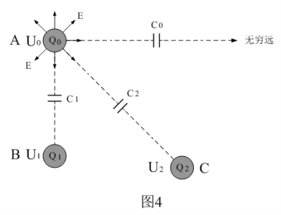 設(shè):物體B和物體C沒受帶電物體A感應(yīng)之前,所帶電荷以及對地電位均為零,則:電荷Q1和Q2,電壓U1和U2都是由于帶電物體A對物體B和物體C感應(yīng)產(chǎn)生的電荷和電壓;U0越高,感應(yīng)產(chǎn)生的U1和U2對地電位就越高,以及電荷Q1和Q2就越多,由此可求得:
