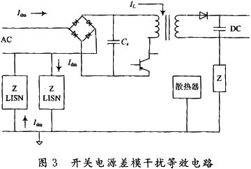 如圖3所示,當(dāng)開關(guān)管轉(zhuǎn)為“開”時(shí),儲(chǔ)能電容Cs的能量由AC電網(wǎng)和整流橋提供,他被開關(guān)管變換器的快速開關(guān)頻率所變換,并通過變壓器形成脈沖電流IL,他具有非常豐富的開關(guān)頻率諧波。儲(chǔ)能電容不是一個(gè)純電容,他有串聯(lián)電阻和電感。當(dāng)整流橋處開關(guān)管“開”時(shí),在AC電網(wǎng)端,IL會(huì)產(chǎn)生一個(gè)由電容的L,R,C所呈現(xiàn)的阻抗電壓,這就是開關(guān)電源產(chǎn)生差模發(fā)射源的原理。差模電流Idm和信號(hào)電流IL沿著導(dǎo)線、變壓器初級(jí)、開關(guān)管組成的回路流通。