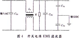 濾波是抑制傳導(dǎo)干擾的一種很好的辦法。在電源輸入端接上濾波器,即可以抑制開關(guān)電源產(chǎn)生并向電網(wǎng)反饋的干擾,也可以抑制來自電網(wǎng)的噪聲對(duì)電源本身的侵害。開關(guān)電源的工作頻率一般在10~130kHz,對(duì)開關(guān)電源產(chǎn)生的高頻段EMI信號(hào),只要選擇相應(yīng)的去耦電路或網(wǎng)絡(luò)結(jié)構(gòu)較為簡單的EMI濾波器,就能達(dá)到理想的濾波效果。干擾抑制電路如圖4所示,CX1和CX2叫做差模電容,L1叫做共模電感,CY1和CY2叫做共模電容。電阻R用于消除可能在濾波器中出現(xiàn)的靜電積累。IEC-380安全技術(shù)條件標(biāo)準(zhǔn)的8.8部分指出,若CX>0.1μF則R=t/2.2C(t=1s,C=2CXμF)。