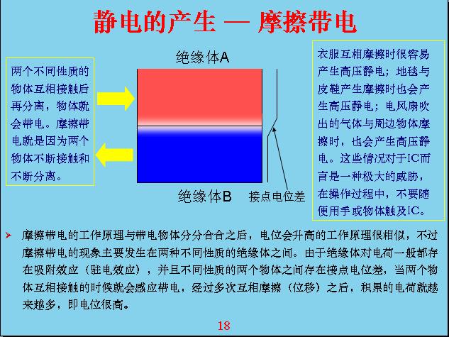舉一個(gè)具體的例子,比如說我現(xiàn)在這個(gè)人站在地上,我是光著腳,地板是導(dǎo)電的,這個(gè)椅子是絕緣的,我從地面一站到椅子上就相當(dāng)于我?guī)щ娏?。為什么?因?yàn)槲以瓉硎菢O化帶電,上面帶負(fù)電,下面帶正電,我站在地上下面就變成零,上面變成了-100v,站上去的時(shí)候相對(duì)來說我就變成帶電的人。所以,很多在半導(dǎo)體車間或者和集成電路接觸、打交道的人,不要隨隨便便用人摸集成電路,因?yàn)槟氵@個(gè)人不知不覺就帶電了,你從門外面走進(jìn)房子里很可能就帶電了,在上樓梯或者地板鋪有一層絕緣的東西,在絕緣以外的時(shí)候你不帶電,站上去就帶電了,因?yàn)樯厦嬗须妼?。還有空調(diào)的風(fēng)吹出來的空氣會(huì)和你身體上面的衣服進(jìn)行摩擦、感應(yīng),它容易帶電,用靜電筆來測(cè),隨便碰衣服或頭發(fā),上面帶的電基本上都有300v左右,如果摩擦幾下大概就有4000-5000v,所以靜電感應(yīng)是相當(dāng)厲害的,很多模型電路在送到工廠的時(shí)候就是用盒子包裝,因?yàn)楹凶邮菍?dǎo)電的,如果用電表去量它好像沒有電阻,電阻是無窮大,其實(shí)它是導(dǎo)電的,相對(duì)來說電導(dǎo)率很低,也就是電阻很大。