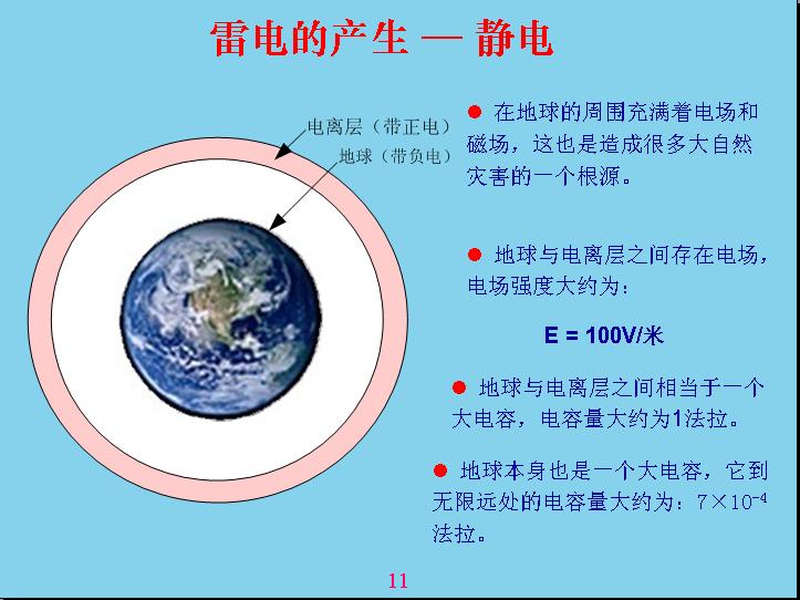 為什么會(huì)產(chǎn)生雷電?可能大部分人都不知道,我在這里就給大家講解一下雷電是怎么產(chǎn)生的。雷電是由于電磁場(chǎng)產(chǎn)生的,世界上什么電都是通過電磁場(chǎng)反應(yīng)產(chǎn)生的。為什么會(huì)產(chǎn)生雷電呢?因?yàn)樵陔x地球30公里外有一個(gè)電離層,電離層實(shí)際上就是最外的空氣受到太陽光、紫外線照射而產(chǎn)生電離,太陽光實(shí)際上也是一種電磁波,電磁波的作用相當(dāng)于我們把一個(gè)食物放在微波爐里面加熱,原理是差不多的,但是微波的波長(zhǎng)線很長(zhǎng),紫外線相當(dāng)短,所以作用不一樣,用微波爐不能把空氣進(jìn)行電離,只有紫外線能夠電離。被電離以后會(huì)分成兩層,一層帶正電,一層帶負(fù)電,與地球相對(duì)的一層帶正電,地球就是帶負(fù)電。地球是一個(gè)圓的,帶電的話相當(dāng)于電層強(qiáng)度是散發(fā)性的,越靠近地球電容強(qiáng)度越高,靠近地球表面是100v,也就是說一米高的位置電容強(qiáng)度是100v電容強(qiáng)度就是用這個(gè)來表示,大家在中學(xué)里面很少用電位梯度的概念表達(dá)電容強(qiáng)度,后面我們?cè)诠ぷ髦羞€是用電位梯度來表示電容強(qiáng)度是最合適的,比如靈敏度、多少毫伏米都是屬于電感強(qiáng)度。以前是用牛頓的力學(xué)來表達(dá),那個(gè)概念相對(duì)來說比較難理解,兩個(gè)帶電物體之間產(chǎn)生多少牛頓力的時(shí)候,換算成單位來表示電容強(qiáng)度,這個(gè)強(qiáng)度不太好理解,如果用電位梯度表示就很方便了。