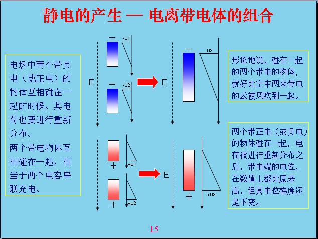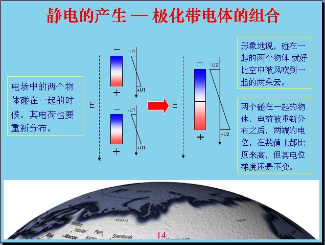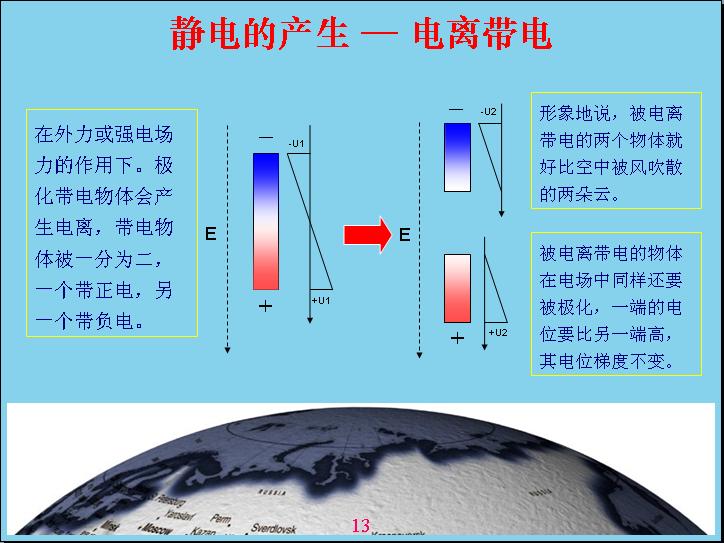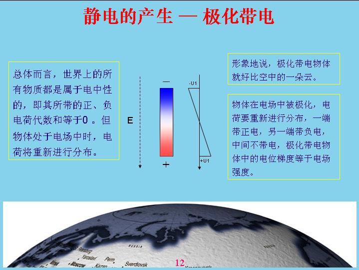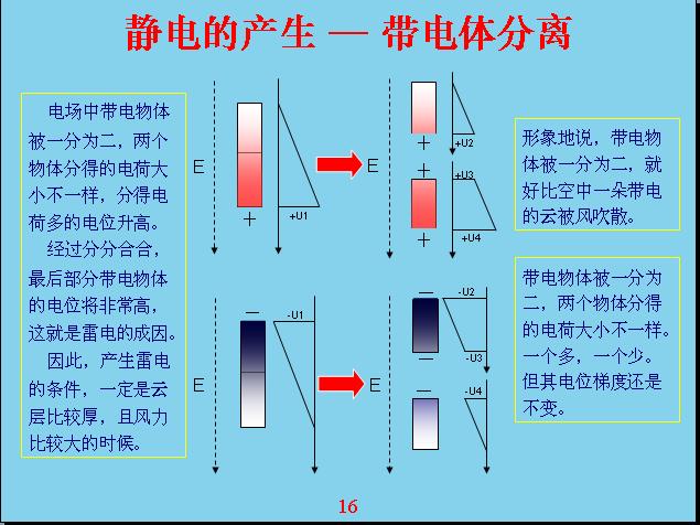 由于地球是帶電的,相對(duì)電容層來說。一個(gè)物體在地球空間里面就會(huì)受到電場(chǎng)的作用產(chǎn)生極化,什么叫極化?就是說一個(gè)物體原來是不帶電的,現(xiàn)在產(chǎn)生極化帶電,一端帶正電,一端帶負(fù)電。比如說這個(gè)源相當(dāng)于一個(gè)導(dǎo)體,如果底下是絕緣的話,上面如果沒有屏蔽,我的上面就帶負(fù)電,下面帶正電,中間這個(gè)地方是不帶電的,人相對(duì)來說還是偏中性,但是雖然極化帶電的,但我總得來說還是變中性,帶的正電和負(fù)電都是相等的。如果把原來極化帶電的物體分成兩個(gè),這兩個(gè)都會(huì)帶電。形象地說,一朵云在電場(chǎng)作用下極化帶電,但沒有產(chǎn)品電流,電感強(qiáng)度沒有達(dá)到這么高,如果把它分成兩塊就會(huì)產(chǎn)生電容帶電。現(xiàn)在由于風(fēng)的作用,把它一吹變成兩塊,中間的地方分成兩塊,有一塊相當(dāng)于帶負(fù)電,有一塊帶正電。這就表示電位曲線,中間這個(gè)地方表示電位反映,上面帶負(fù)電,下面帶正電,這個(gè)幅度越高表示帶電幅度也越高。這個(gè)沒有帶正電,那個(gè)沒有帶負(fù)電,電容性就破壞了,相對(duì)來說是帶負(fù)電,這個(gè)帶正電的。云帶電就是因?yàn)檫@樣產(chǎn)生的。