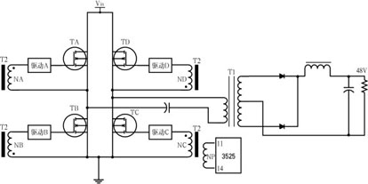 實(shí)際電路都是由非理想元件組成的,在設(shè)計(jì)中可能會(huì)遇到許多預(yù)料不到的情況。在調(diào)試如圖1所示的普通全橋電源時(shí),輸出不是料想中平穩(wěn)的波形,而是不時(shí)發(fā)生間歇振蕩,并發(fā)出“吱吱”聲,有時(shí)甚至?xí)龤ч_(kāi)關(guān)管。對(duì)電路進(jìn)行分析后未發(fā)現(xiàn)結(jié)構(gòu)上可能導(dǎo)致不穩(wěn)定的因素,于是改變輸出采樣的電壓比,將輸出調(diào)定在半電壓24V上,使用90V的輸入直流電壓,在保證功率管安全的情況下進(jìn)行調(diào)試。待電路工作正常后,再緩慢升高輸入直流電壓,經(jīng)過(guò)多次試驗(yàn),發(fā)現(xiàn)當(dāng)Ui為180~250V時(shí)就可能引發(fā)振蕩,最后判定是驅(qū)動(dòng)變壓器各個(gè)繞組之間的分布電容在搗亂。