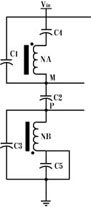 兩只開(kāi)關(guān)管的電容分布如圖2所示,其中C2是繞組NA的下端M與NB的上端P間的分布電容。當(dāng)驅(qū)動(dòng)變壓器的繞組NA輸出正脈沖時(shí)NB輸出負(fù)脈沖,TA管由截止轉(zhuǎn)為飽和導(dǎo)通,于是TA管的源極即M點(diǎn)的電位急速升高,并通過(guò)電容C2提升NB繞組上端P的電位,升高的數(shù)值與兩個(gè)繞組的分布電容C1、C2、C3有關(guān),還和P點(diǎn)到地的高頻阻抗以及M點(diǎn)電位上升的速度有關(guān)。如果提升的數(shù)值大于NB繞組自身的負(fù)脈沖幅度,就會(huì)引發(fā)TB管的瞬時(shí)導(dǎo)通,從而出現(xiàn)前面所述的間歇振蕩。其他各管導(dǎo)通時(shí)也會(huì)有類(lèi)似情況發(fā)生。