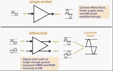 如圖2所示,單端信號會對共模噪聲、電源噪聲和電磁干擾比較敏感,運放會對這些噪聲一定程度的放大。而差分信號由于兩側(cè)信號自身形成電流回路,抑制了共模噪聲和干擾,僅對差模信號進行有效放大。