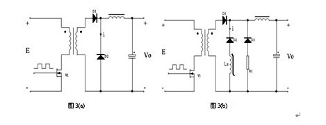 在圖3(a)所示的正激電源電路中,當初級功率管V1開始導通,次級整流二極管D1開始導通,D2開始截止時,由于二極管PN結(jié)的電荷存儲效應(yīng),D2中流過了電流變化率di/dt很大的反向恢復尖峰電流i,致使V1、D1中也有相應(yīng)的尖峰電流流過,在漏感、線電感等因素的共同作用下會在電源輸出端產(chǎn)生高頻的導通噪聲。在D2上施加的反向電壓越大,D2的反向恢復時間越長,反向恢復電流變化率di/dt就越大,電源輸出噪聲也就越大。大的反向恢復尖峰電流,不僅會產(chǎn)生電源噪聲,也容易損壞整流器件。[page]