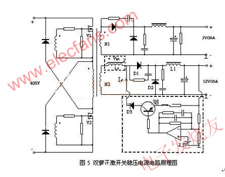 磁放大器穩(wěn)壓是利用可飽和電感導通延時的物理特性來控制開關(guān)電源的占空比和輸出功率,穩(wěn)定電源輸出電壓的一種方法。在可飽和電感上加上適當?shù)牟蓸雍涂刂圃?,調(diào)節(jié)其導通延時的時間,就可以構(gòu)成最常見的磁放大器穩(wěn)壓電路。圖5是一個輸入為110Vac~220Vac/50HZ,輸出為5Vdc/20A,12Vdc/10A的雙管正激開關(guān)穩(wěn)壓電源,其中5V是主控回路。其輔路12V輸出電流較大,對穩(wěn)壓精度和負載穩(wěn)定度都有較高要求,采用普通的方法穩(wěn)壓效果都不是很理想,如果采用磁放大器穩(wěn)壓技術(shù)就可圓滿解決這一問題,使穩(wěn)壓電路的結(jié)構(gòu)簡單,耗散功率小,并可達到毫伏級的穩(wěn)壓精度。