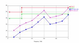 對于電子產品的電磁輻射,國際電工委(IEC:InternationalElectrotechnicalCommission)制定了強制標準。通常,印制板都只是系統(tǒng)中的一部分,在進行電磁輻射分析的時候除了要考慮印制板本身的輻射問題外,還需要考慮系統(tǒng)中其它設備對對電磁輻射的影響,尤其是帶有通風孔機箱的屏蔽效能。CST印制板工作室在進行SI仿真的同時,可以得到印制板上電流分布的幅度和相位信息,并通過與CST微波工作室的協(xié)同將該電流分布作為激勵源,然后再加上機箱,充分考慮孔、縫對電磁輻射的影響。仿真的結果自動與內嵌的EMC國際標準限值進行對比,如圖16所示。