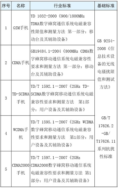 不同制式的手機(jī)電磁兼容測試時,選擇不同的行業(yè)標(biāo)準(zhǔn),依據(jù)的基礎(chǔ)標(biāo)準(zhǔn)相同,見下表1。