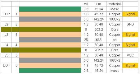 當(dāng)制作某一特定厚度的印制板時,一方面要求合理地選擇各種材料的參數(shù),另一方面,半固化片最終成型厚度也會比初始厚度小一些。下面是一個典型的6層板疊層結(jié)構(gòu):