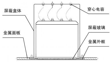 儀表窗口對設(shè)備來說是比較大的泄漏口,必須采取有效的措施將其屏蔽,為此采用加裝絲網(wǎng)屏蔽玻璃的方法對數(shù)字電流表、數(shù)字電壓表進(jìn)行外部屏蔽。絲網(wǎng)屏蔽玻璃是由一種低阻抗的金屬絲網(wǎng)通過特殊工藝夾在兩層玻璃之間制成,絲網(wǎng)篩孔的密度決定其主要的屏蔽效能。如圖1 所示,由于玻璃周邊預(yù)留了10~ 20 mm 金屬絲網(wǎng)毛邊,通過螺裝金屬外框?qū)⑺o緊壓在機(jī)箱上,從而獲得連續(xù)的導(dǎo)電表面,以達(dá)到減少電磁泄露的目的。