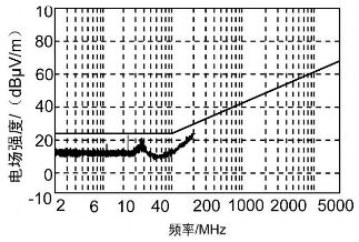 對RE102 試驗(yàn)項(xiàng)目進(jìn)行觀察,發(fā)現(xiàn)測試結(jié)果圖的超標(biāo)點(diǎn)為24 MHz、36 MHz 兩點(diǎn),而這兩點(diǎn)分別是12 MHz 頻率點(diǎn)的二三次諧波。為了找到這一頻率點(diǎn)的元器件,對機(jī)箱內(nèi)各單元進(jìn)行了分析,發(fā)現(xiàn)控制保護(hù)單元中有一個(gè)12MHz 晶振,由于晶振屬于高噪聲元器件,能夠產(chǎn)生較強(qiáng)的輻射,從而使其周邊充滿著近場輻射場。如果輻射場內(nèi)有器件或走線,晶振及其諧波信號(hào)將耦合到器件或走線上而輻射出去;再者又發(fā)現(xiàn)控制保護(hù)單元的PCB 板未采取就近接地措施,只是通過一根長引線和機(jī)殼地相連,造成信號(hào)的環(huán)路面積增大,產(chǎn)生了很強(qiáng)的輻射,所以對控制保護(hù)單元采取措施應(yīng)該是行之有效的。首先對晶振進(jìn)行屏蔽且屏蔽體就近接地,弱化輻射發(fā)射強(qiáng)度; 然后控制保護(hù)單元的PCB 板同樣采取就近接地措施,并且在屏蔽盒出口處的信號(hào)線上安裝一個(gè)鐵氧體磁環(huán),可以將不需要的高頻干擾抑制掉。通過采取以上措施后,RE102 試驗(yàn)指標(biāo)合格,如圖3 所示。