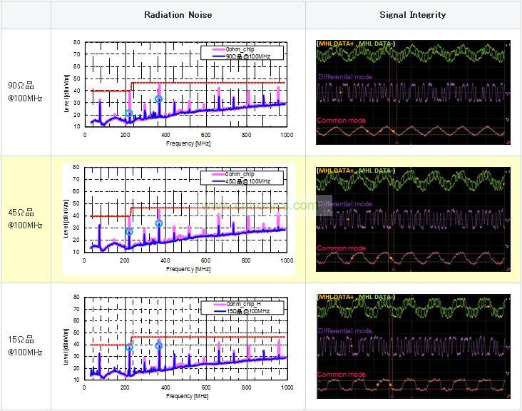 使用共模扼流線圈時(shí)的靜噪效果及信號(hào)波形評(píng)測圖5顯示的MHL信號(hào)線使用各種共模扼流線圈時(shí)的輻射噪聲/信號(hào)波形評(píng)測結(jié)果。共模扼流線圈在產(chǎn)生噪聲的30MHz~1GHz頻率段內(nèi),按照阻抗由高到低的順序,分別使用以下3種類型(90Ω、45Ω、15Ω@100MHz) (靜態(tài)特性請(qǐng)參考圖6) 來進(jìn)行測量。