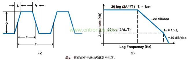 對(duì)于CCM中運(yùn)作的降壓轉(zhuǎn)換器,電感電流一直是非零的正電流。在這種情況下,負(fù)載周期為D=Vout/Vin,在本例中為38%(5V/14V)。使用200kHz的開(kāi)關(guān)頻率時(shí),我們很快計(jì)算出導(dǎo)通時(shí)間為1.8μs。為支持此頻率,控制開(kāi)關(guān)的上升/下降時(shí)間必須小于90納秒。這使得我們注意到第一個(gè)減少噪聲的方法,也就是斜率控制。您可能還無(wú)法理解,但是此時(shí)我們非常了解與PWM切換節(jié)點(diǎn)有關(guān)的諧波,也就是開(kāi)關(guān)穩(wěn)壓器的控制波形。如果將此波形以圖1(a)中所示的梯形表示,波形的諧波便能夠以圖1(b)中的內(nèi)容表示,這表明了EMI背后的驅(qū)動(dòng)因素。這一傅里葉包絡(luò)定義了可通過(guò)傅里葉分析或計(jì)算梯形波形導(dǎo)通時(shí)間及上升時(shí)間取得的諧波振幅。