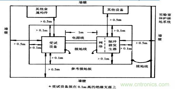 ① 試驗應(yīng)在試驗室中央進行,除位于試品及試驗儀器下方的參考接地板外,它們與其他所有導(dǎo)電性結(jié)構(gòu)(例如屏蔽室里的墻壁和實驗室里的其他有金屬結(jié)構(gòu)的試驗儀器和設(shè)備)之間的最小距離為0.5m,以避免脈沖群干擾中輻射成分的反射,再與原先的干擾疊加,對試驗結(jié)果產(chǎn)生影響。