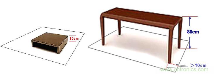 ④ 落地的試品要用0.1±0.01m的絕緣座隔開后放在參考接地板上。對于臺式試品,應(yīng)放置在離參考接地板高度為0.8±0.08m的木頭臺子上,試品(或試驗臺子)距參考接地板邊緣的最小尺寸滿足項①(0.1m)的規(guī)定。