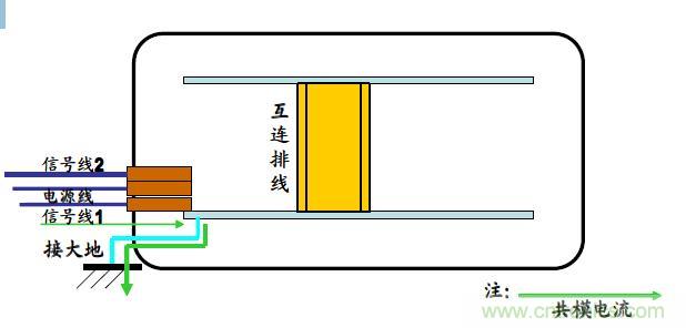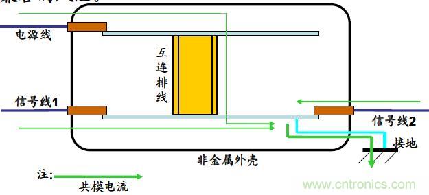 結(jié)構(gòu)和接地也是抑制脈沖群干擾的很重要的方面。圖示為一個(gè)非金屬外殼的電子設(shè)備,首先電源線遠(yuǎn)離接地點(diǎn),接地路徑較長,接地效果大大降低。其次,信號線1遠(yuǎn)離接地點(diǎn),導(dǎo)致干擾脈沖施加在電源線和信號線1上時(shí),脈沖群的共模干擾電流要經(jīng)互連線和下面的線路板,最終經(jīng)接地端子入地。由于互連線的阻抗較大,而且接地路徑又長(接地阻抗也大),大大增加了電磁兼容的風(fēng)險(xiǎn)。