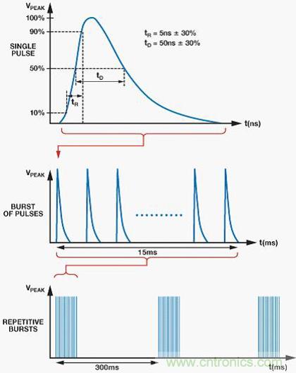 電快速瞬變測試要求將數(shù)個極端快速的瞬變脈沖耦合到信號線上,以代表容性耦合到通信端口的外部開關(guān)電路的瞬態(tài)干擾,這種干擾可能包括繼電器和開關(guān)觸點抖動,以及切換感性或容性負(fù)載引起的瞬變,所有這些在工業(yè)環(huán)境中非常常見。EC 61000-4-4中定義的EFT測試嘗試模擬因為這些類型的事件產(chǎn)生的干擾。