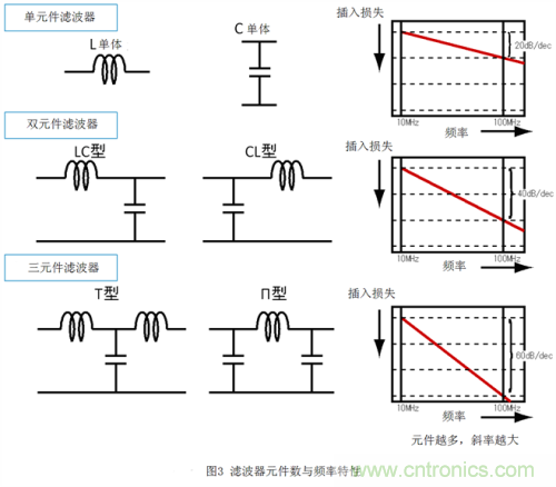 圖 3顯示了組成濾波器的元件數(shù)與濾波器頻率特性之間的關(guān)系。想知道什么是插入損耗,可以看一下圖中各濾波器的信號衰減量,圖越往下衰減量越多。從圖上我們可 以看到,濾波器中的元件越多,頻率特性的斜率就越大。元件較少的濾波器的頻率特性范圍較窄(斜率較?。p頻率及通過頻率的選擇度較低,有可能導(dǎo)致部分 信號衰減或者噪聲沒有徹底去除。另一方面,元件較多的濾波器的頻率特性范圍較寬(斜率較大),頻率的選擇度較高,信號可以在幾乎不衰減的狀態(tài)下去除噪聲。