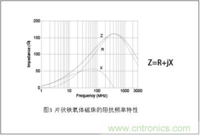 [page]除了片狀以外,還通過將內(nèi)部加工成線圈結(jié)構(gòu),獲得了比起僅僅由一根導(dǎo)線通過的引線型磁珠電感器更大的阻抗值。(實(shí)際也存在采用了僅有導(dǎo)線通 過這一結(jié)構(gòu)的片狀鐵氧體磁珠)。這一結(jié)構(gòu)基本上與片狀疊層電感器相同,但與電感器的不同之處在于鐵氧體材料更適合于噪聲對(duì)策。圖3是片狀鐵氧體磁珠阻抗頻 率特性的例子。從圖中可以看出,與電感器基本相同,它的阻抗也是隨著頻率的上升而增大,將其串聯(lián)在電路中可以起到低頻濾波器的作用。在普通電感器的阻抗值 (Z)里,主要是電抗成分(X),而片狀磁珠則由于采用了高頻范圍損耗較大的鐵氧體材料,因此高頻段中主要是電阻成分(R)。由于電抗成分不會(huì)損耗而電阻 成分會(huì)出現(xiàn)損耗,因此片狀磁珠比起一般的電感器來說其吸收噪聲能量的性能更好,噪聲抑制的效果也更好。