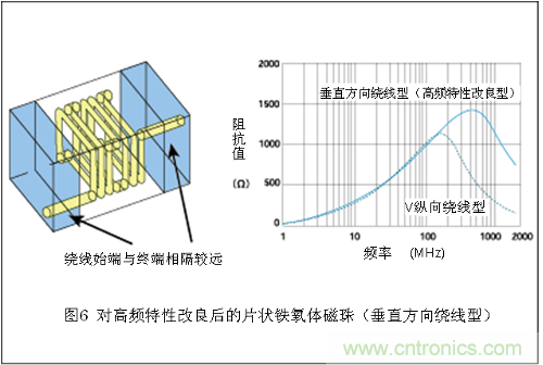 為了解決這一問題,就需要對(duì)繞線始端與終端接近這一構(gòu)造進(jìn)行改善。圖6就是為了改善高頻特性而對(duì)片狀鐵氧體磁珠的內(nèi)部結(jié)構(gòu)進(jìn)行了調(diào)整的一例。通常, 片狀鐵氧體磁珠的導(dǎo)體線圈的軸是垂直方向的(也就是縱向繞線),而改良了高頻特性的磁珠的導(dǎo)體線圈的軸則是水平方向的。通過這一改動(dòng),增大了線圈繞線始端 與終端之間的距離,阻抗開始減少的起始頻率就得到了大幅度提高。