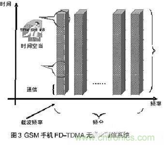 GSM(全球通)手機標(biāo)準(zhǔn)使用頻分多路傳輸和時分多路傳輸,同時傳送大量電話,如圖3所示。
