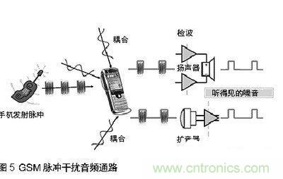 當(dāng)手機與基站通訊,或兩個手機彼此接近時,發(fā)射脈沖通過擴音器,揚聲器,或頭戴式耳機線傳人音頻通路。見圖5。結(jié)果是音頻質(zhì)量大幅降低。