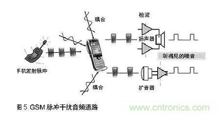 當(dāng)手機(jī)與基站通訊,或兩個(gè)手機(jī)彼此接近時(shí),發(fā)射脈沖通過(guò)擴(kuò)音器,揚(yáng)聲器,或頭戴式耳機(jī)線(xiàn)傳入音頻通路。見(jiàn)圖5,結(jié)果是音頻質(zhì)量大幅降低。