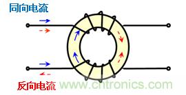 共模扼流圈。共模扼流圈的基本構(gòu)造如圖1所示:一個(gè)磁芯里面有兩根繞線。這兩個(gè)繞線對(duì)應(yīng)的逆向電流流過(guò)時(shí)磁芯里產(chǎn)生的磁通會(huì)相互反向抵消,而同向的電流流過(guò)時(shí)磁通會(huì)相互向同方向產(chǎn)生,因此阻抗較高。通過(guò)這種方式共模扼流圈可以通過(guò)相互反向的差分信號(hào)但是卻可以抑制同向傳輸?shù)墓材T肼暋?/div>