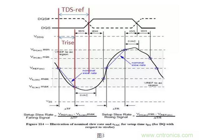 如圖3,建立時間等于TDS-ref(在ref處的建立時間)減去Trise(Vref到VIH AC的時間)。規(guī)范中的基準(zhǔn)值是預(yù)減去了這個Trise的,這個預(yù)減去的值是特定slew rate為1V/ns時的值,若判斷門限是AC175,則預(yù)減去175ps。請再看圖2,當(dāng)slew rate等于1V/ns時,derating為0,不需要調(diào)整;當(dāng)slew rate大于1V/ns(更快)時,從Vref到Vih(ac)所需的時間就少,預(yù)減多了,要補回來,所以取值為正;當(dāng)slew rate小于1V/ns(更慢)時就預(yù)減少了,所以取值為負。從圖2中的取值關(guān)系推導(dǎo)出取值公式為Derating @AC175 = 175ps - 175mV/SR,大家可以代入計算一下試試。如果判斷門限是AC150或其他都可以套用。而保持時間是DC門限,其公式為Derating @DC100 = 100ps - 100mV/SR。