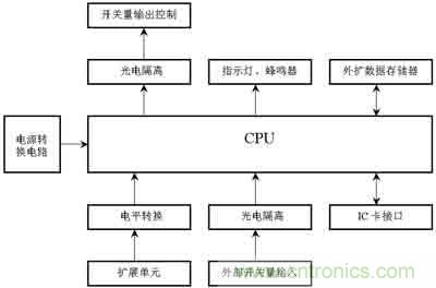 圖1為汽車行駛記錄儀硬件結(jié)構(gòu)原理。信號(hào)的抗干擾處理是通過光電隔離來實(shí)現(xiàn)。車載設(shè)備的電源系統(tǒng)對設(shè)備的可靠運(yùn)行影響很大,好的電源電路能夠過濾掉許多通過電源線傳入的干擾信號(hào)。