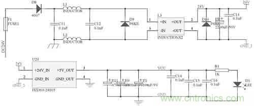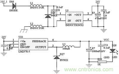 本控制模塊的電源電路如圖2所示。車載蓄電池—發(fā)電機(jī)的電源從24V_1處進(jìn)入,二極管D16主要是防止電源的正負(fù)極被誤接反。電感L1、L2對電源進(jìn)行濾波,和共模電感L3、電容C8配合,可以過濾掉電源中的尖峰脈沖。二極管D24 P6KE51A是脈沖干擾抑制器(TVS),它可以快速吸收超過額定電壓的尖峰脈沖,瞬時(shí)通過電流很大,最大功率可達(dá)500~1000W。電容E5和C9進(jìn)一步對電源進(jìn)行濾波。過濾干凈的電流通過開關(guān)電源芯片LM2576變換為系統(tǒng)使用的5V電源。電容E7和C11對輸出5V電源進(jìn)行濾波,電阻R18和發(fā)光二極管D28指示當(dāng)前是否有電。