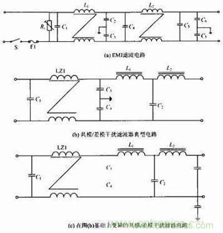 開(kāi)關(guān)電源對(duì)內(nèi)、外的干擾及抗干擾中,共模信號(hào)與開(kāi)關(guān)器件的工作方式、散熱器的安裝及整機(jī)PCB板與機(jī)殼的連接有相當(dāng)復(fù)雜的關(guān)系,共模信號(hào)在一定 的條件下又可轉(zhuǎn)變成差模信號(hào)。其中解決共模干擾除了上述一般的EMI濾波電路,還可按如下電路圖的思想在電路上改進(jìn),使開(kāi)關(guān)電源能夠在電路上改進(jìn)從而提高 性能。圖1(b)為共模/差模干擾濾波器典型電路,圖1(c)為在圖1(b)基礎(chǔ)上變異的共模/差模干擾濾波電路。