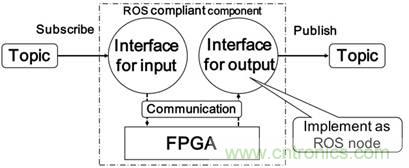Rosbridge為ROS與FPGA的聯(lián)通提供了一種溝通機(jī)制,但是在這種機(jī)制中,ROS Node并不能運(yùn)行在FPGA上,而且通過(guò)JSON API的連接機(jī)制也帶來(lái)了一定的性能損耗。為了讓FPGA與ROS更好的耦合,最近日本的研究人員提出了ROS-Compliant FPGA的設(shè)計(jì),讓ROS Node可以直接運(yùn)行在FPGA上。如圖10所示,在這個(gè)設(shè)計(jì)中,F(xiàn)PGA了實(shí)現(xiàn)一個(gè)輸入的接口,這個(gè)接口可以直接訂閱ROS的topic,使數(shù)據(jù)可以無(wú)縫連接流入FPGA計(jì)算單元中。另外,F(xiàn)PGA上也實(shí)現(xiàn)了一個(gè)輸出接口, 讓FPGA上的ROS Node可以直接發(fā)表數(shù)據(jù),讓訂閱這個(gè)topic的其他ROS Node可以直接使用FPGA產(chǎn)出的數(shù)據(jù)。在這個(gè)設(shè)計(jì)中,開(kāi)發(fā)者只要把自己開(kāi)發(fā)的FPGA計(jì)算器插入到ROS-compliant的FPGA框架中,便可以無(wú)縫連接其他ROS Node。