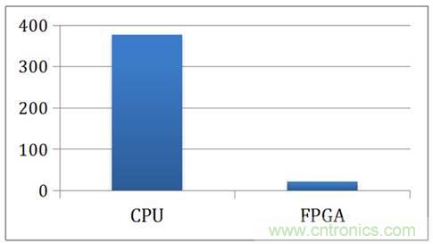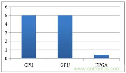 為了讓讀者了解FPGA對(duì)深度學(xué)習(xí)的加速以及節(jié)能,我們下面關(guān)注北京大學(xué)與加州大學(xué)的一個(gè)關(guān)于FPGA加速CNN算法的合作研究。圖7展示了FPGA與CPU在執(zhí)行CNN時(shí)的耗時(shí)對(duì)比。在運(yùn)行一次迭代時(shí),使用CPU耗時(shí)375毫秒,而使用FPGA只耗時(shí)21毫秒,取得了18倍左右的加速比。假設(shè)如果這個(gè)CNN運(yùn)算是有實(shí)時(shí)要求,比如需要跟上相機(jī)幀率(33毫秒/幀),那么CPU就不可以達(dá)到計(jì)算要求,但是通過(guò)FPGA加速后,CNN計(jì)算就可以跟上相機(jī)幀率,對(duì)每一幀進(jìn)行分析。