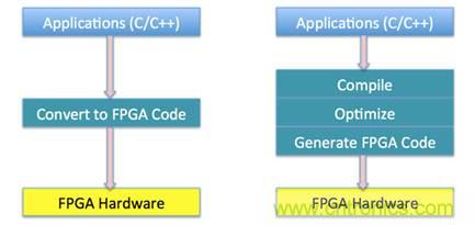 圖4 傳統(tǒng)FPGA開(kāi)發(fā)流程與C-to-FPGA開(kāi)發(fā)流程