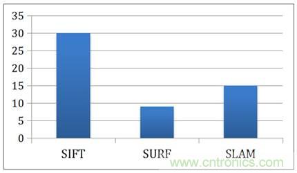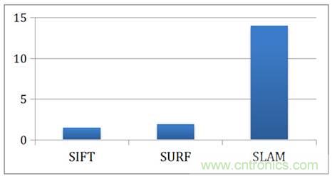 圖6展示了FPGA相對(duì)CPU在執(zhí)行SIFT、SURF以及SLAM算法的節(jié)能比。使用FPGA后,SIFT與SURF分別取得了1.5倍與1.9倍的節(jié)能比,而SLAM的算法取得了14倍的節(jié)能比。根據(jù)我們的經(jīng)驗(yàn),如果機(jī)器人將手機(jī)電池用于一個(gè)多核的Mobile CPU去跑這一套感知算法,電池將會(huì)在40分鐘左右耗光。但是如果使用FPGA進(jìn)行計(jì)算,手機(jī)電池就足以支撐6小時(shí)以上,即可以達(dá)到10倍左右的總體節(jié)能 (因?yàn)镾LAM的計(jì)算量比特征提取高很多)。