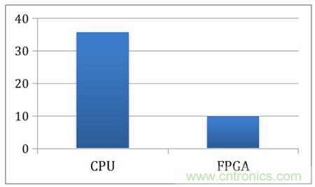 為了讓讀者對(duì)FPGA加速有更好的了解,我們總結(jié)了微軟研究院2010年對(duì)BLAS算法的FPGA加速研究。BLAS是矩陣運(yùn)算的底層庫(kù),被廣泛運(yùn)用到高性能計(jì)算、機(jī)器學(xué)習(xí)等領(lǐng)域。在這個(gè)研究中,微軟的研究人員分析了CPU、GPU以及FPGA對(duì)BLAS的加速以及能耗。圖2對(duì)比了FPGA以及CPU、GPU執(zhí)行GaxPy算法每次迭代的時(shí)間,相對(duì)于CPU,GPU與FPGA都達(dá)到了60%的加速。圖中顯示的是小矩陣運(yùn)算,隨著矩陣的增大,GPU與FPGA相對(duì)與CPU的加速比會(huì)越來(lái)越明顯。