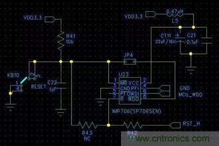 本人有一次對(duì)整機(jī)EMC整改,ESD試驗(yàn)時(shí),按鍵控制板的MCU老是復(fù)位。后來用示波器進(jìn)行追蹤,發(fā)現(xiàn)是外部看門狗芯片發(fā)生復(fù)位,導(dǎo)致MCU復(fù)位。于是先在電源上并接TVS管,還是會(huì)復(fù)位;再在看門狗芯片VCC管腳旁并接22uF鉭電容,情況好一些,但還是會(huì)復(fù)位;最后再串接一個(gè)0.47uH的貼片電容,組成LC濾波(如圖3.1所示)。在+-6KV的ESD接觸放電下,就再也不會(huì)復(fù)位,而且工作正常。