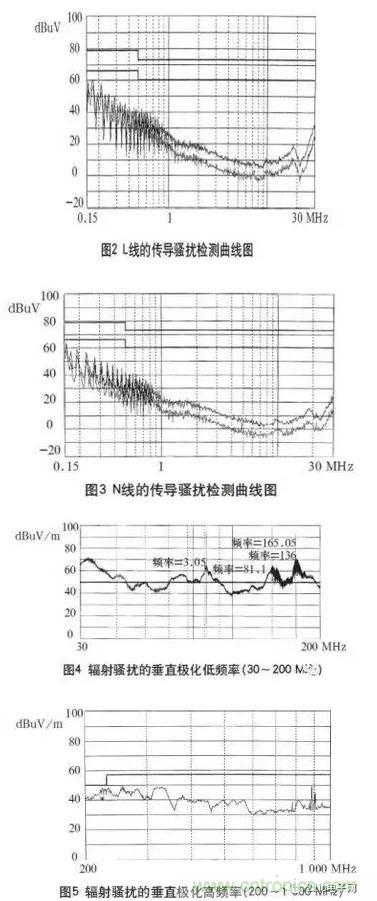 在3m法電波暗室對試驗樣機進行測試,其L、N線的傳導(dǎo)騷擾檢測曲線如圖2、3所示,輻射騷擾的垂直極化掃描曲線如圖4、5所示。