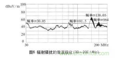 本開關(guān)電源一次通過了傳導(dǎo)騷擾的測試,測試波形如圖2、3所示。輻射騷擾高頻段230~1000MHz也測試合格,如圖5所示。只是在30~200MHz頻段范圍內(nèi)的垂直極化指標(biāo)超標(biāo),最大超標(biāo)20dB,如圖4所示。
