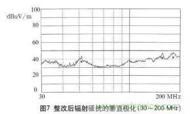 根據(jù)對開關(guān)電源電磁騷擾源的分析可知,在圖1b電路中高頻變壓器T1也是一個騷擾源。為了阻止高頻變壓器產(chǎn)生的騷擾信號以輻射方式發(fā)射,把變壓器的外殼用屏蔽材料銅箔環(huán)繞一圈構(gòu)成一回路加以屏蔽,以切斷變壓器通過空間耦合形成的輻射騷擾傳播途徑。并且為了減少因變壓器一次側(cè)開通時電流瞬間突變產(chǎn)生的di/dt騷擾,在變壓器T1的一次側(cè)串進1個電感,以減小器件的開通損耗,降低輻射騷擾信號。經(jīng)過整改后,輻射騷擾大大下降,再次對本電源輻射騷擾進行測試,完全達到了標(biāo)準(zhǔn)要求,其測試結(jié)果如圖7所示。