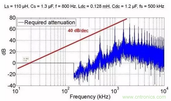 我知道很多人會(huì)說(shuō),怎么可能,di/dt和dv/dt都大了,怎么可能EMI濾波體積還小了。我想說(shuō)一句,共模和差模濾波器的沒(méi)有區(qū)別,相同的截止頻率下,高頻的衰減更大!就算你高頻下共模噪聲越大,但是你的記住,這個(gè)頻率下LC濾波器的衰減更大,想想幅頻曲線吧。為了說(shuō)明這個(gè)結(jié)論,我給出一些定量分析結(jié)果。這些EMI分析均基于AC/DC三相整流,拓?fù)錇榫S也納整流。我分別給出了1Mhz和500Khz的共模噪聲,可以看出,500khz共模濾波器需要的截止頻率為19.2kHz,1MHz為31.2kHz。