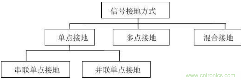 接地沒有一個很系統(tǒng)的理論或模型,人們在考慮接地時只能依靠他過去的經(jīng)驗或從書上看到的經(jīng)驗。接地的方法很多,具體使用那一種方法取決于系統(tǒng)的結(jié)構(gòu)和功能。接地的方式可以分為三種:單點接地,多點接地和混合接地。其中單點接地可以分為串聯(lián)單點接地和并聯(lián)單點接地兩種,如圖所示。
