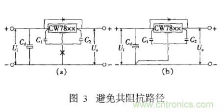 電源線的布置要根據(jù)電流的大小盡量加粗走線寬度。在布線工作的最后,用地線將電路板沒有走線的地方鋪滿(大面積) 。在接地時還需要避免共阻抗路徑,如圖8-10所示穩(wěn)壓器電路的“調(diào)整端的取樣點”或“公共點”,千萬不能接在有負載電流流過的輸出線和公共地線上如圖(a)所示,應(yīng)從管腳’根部’單獨另外用引線引出如圖(b)所示。
