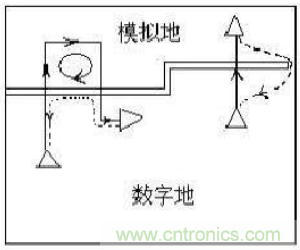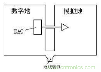 接地技術(shù)中還有一個很重要的部分就是數(shù)字電路與模擬電路的共地處理。一般說來,數(shù)字電路的頻率高,而模擬電路的對噪聲的敏感度強,正因為如此,高頻的數(shù)字信號線要盡可能遠離敏感的模擬電路器件,同樣,彼此的信號回路也要相互隔離,這就牽涉到模擬和數(shù)字地的劃分問題。一般的做法是,模擬地和數(shù)字地分離,只在某一點連接,這一點通常是在PCB板總的地線接口處,或者在數(shù)模轉(zhuǎn)換器的下方,必要時可以使用磁性元件(如磁珠)連接,如圖所示。