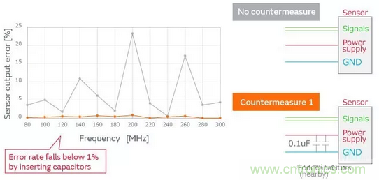 傳感器的電源線受噪聲影響,會發(fā)生傳感器輸出值的異常(輸出誤差)。將注入電源線的噪聲級固定,對對策前后的輸出誤差的大小進(jìn)行調(diào)查。