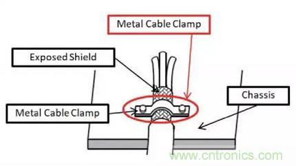 一個好的電磁干擾屏蔽是通過一個完整的360°外殼周圍的保護裝置來完成。完整的360°屏蔽是環(huán)繞整個受保護設備(例如電纜)并將其連接到底盤(見圖1)的環(huán)向終止端子上。